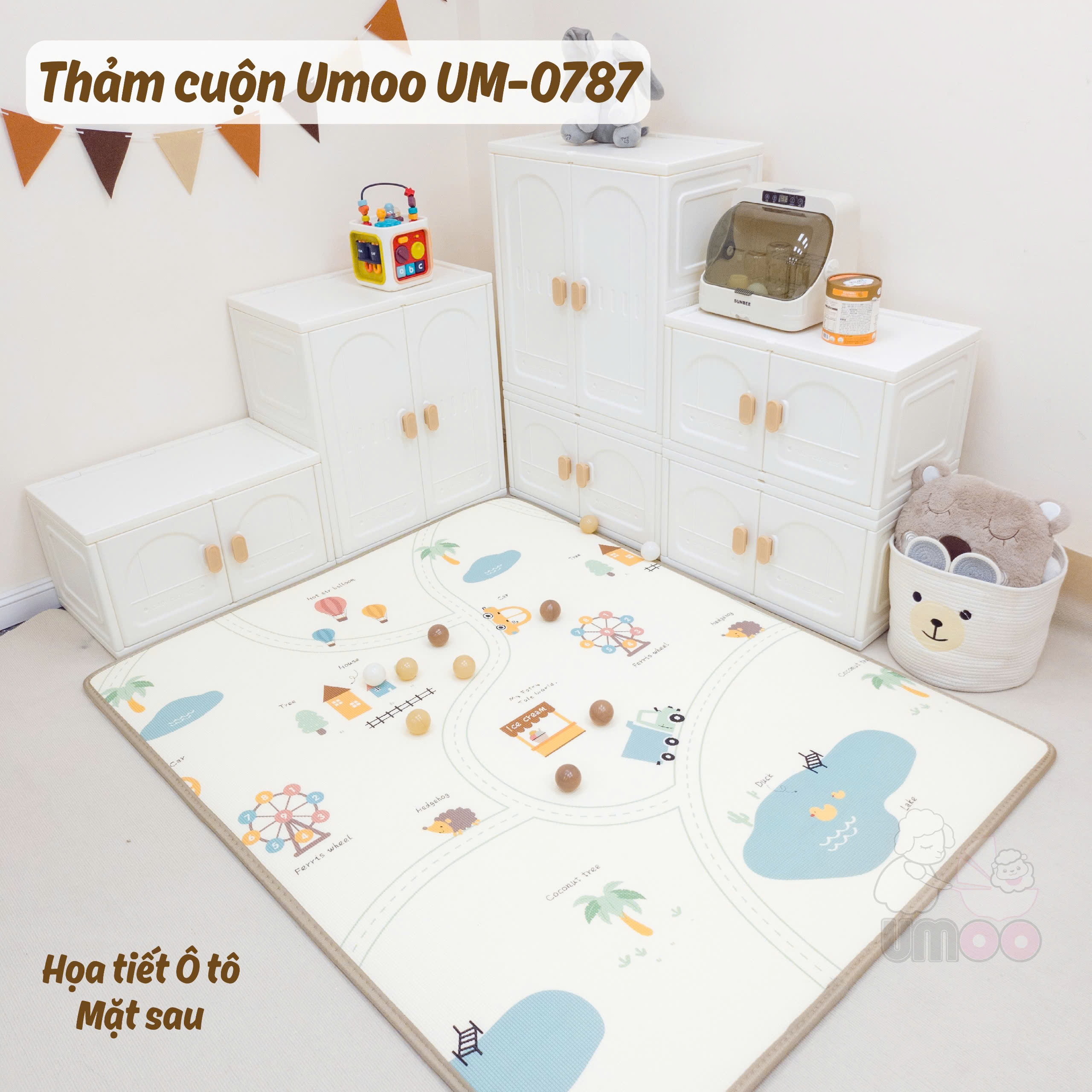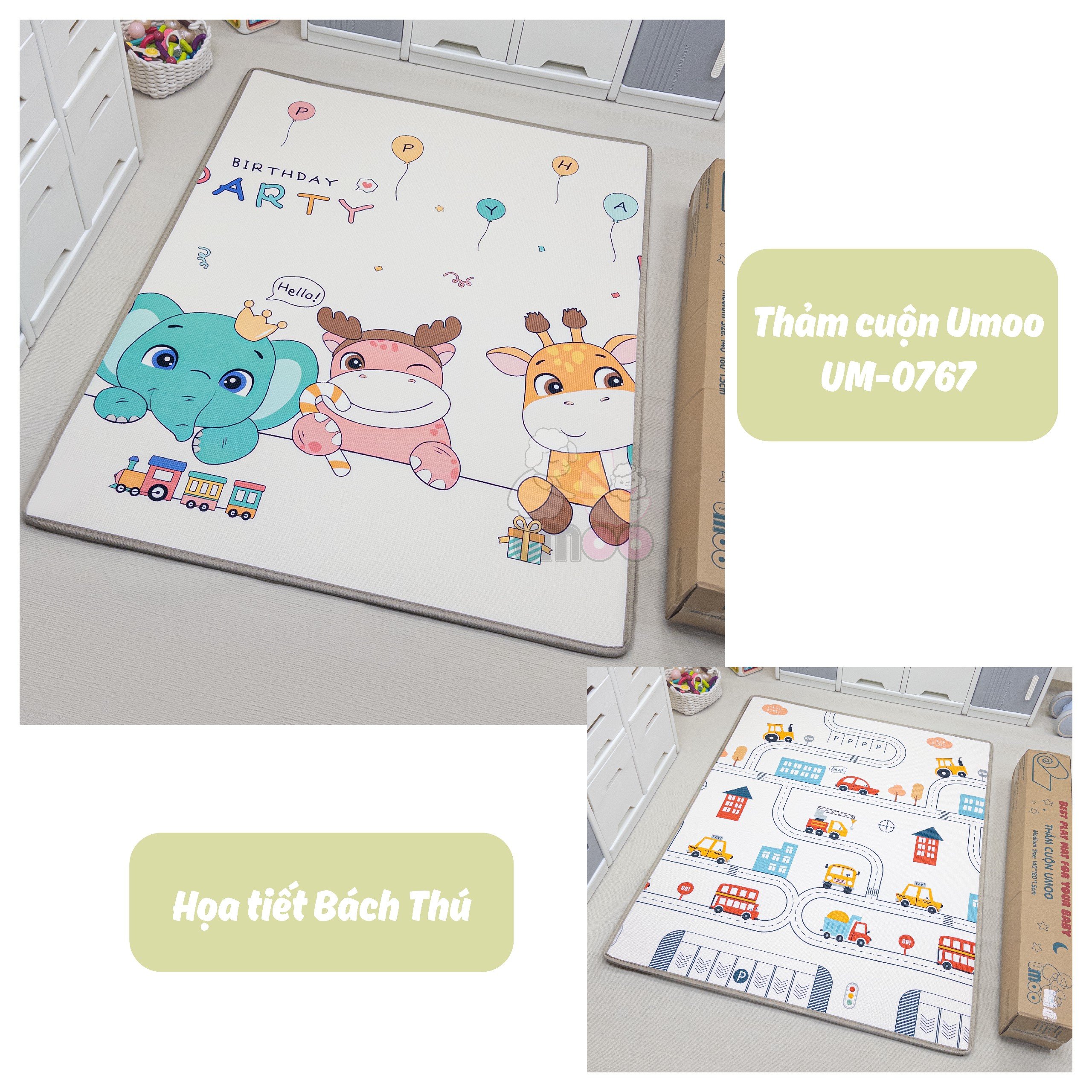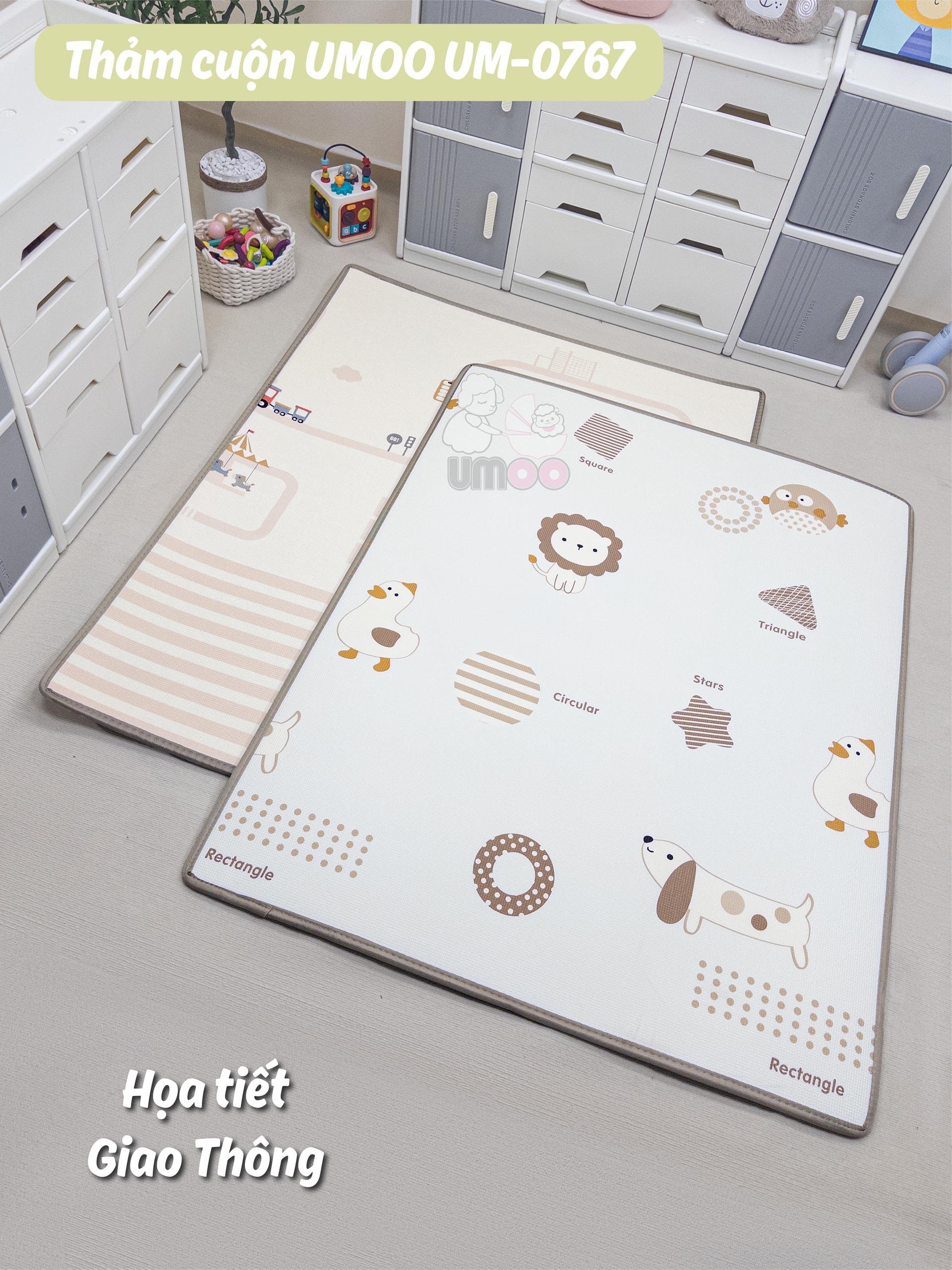Thảm cuộn Umoo sử dụng được cả 2 mặt, mỗi mặt lại có những hình ảnh ngộ nghĩnh kích thích thị giác của bé và giúp bé học hỏi như hình các con vật, chữ số hay các loại xe cộ. Bé học được vô vàn các con vật và màu sắc.
