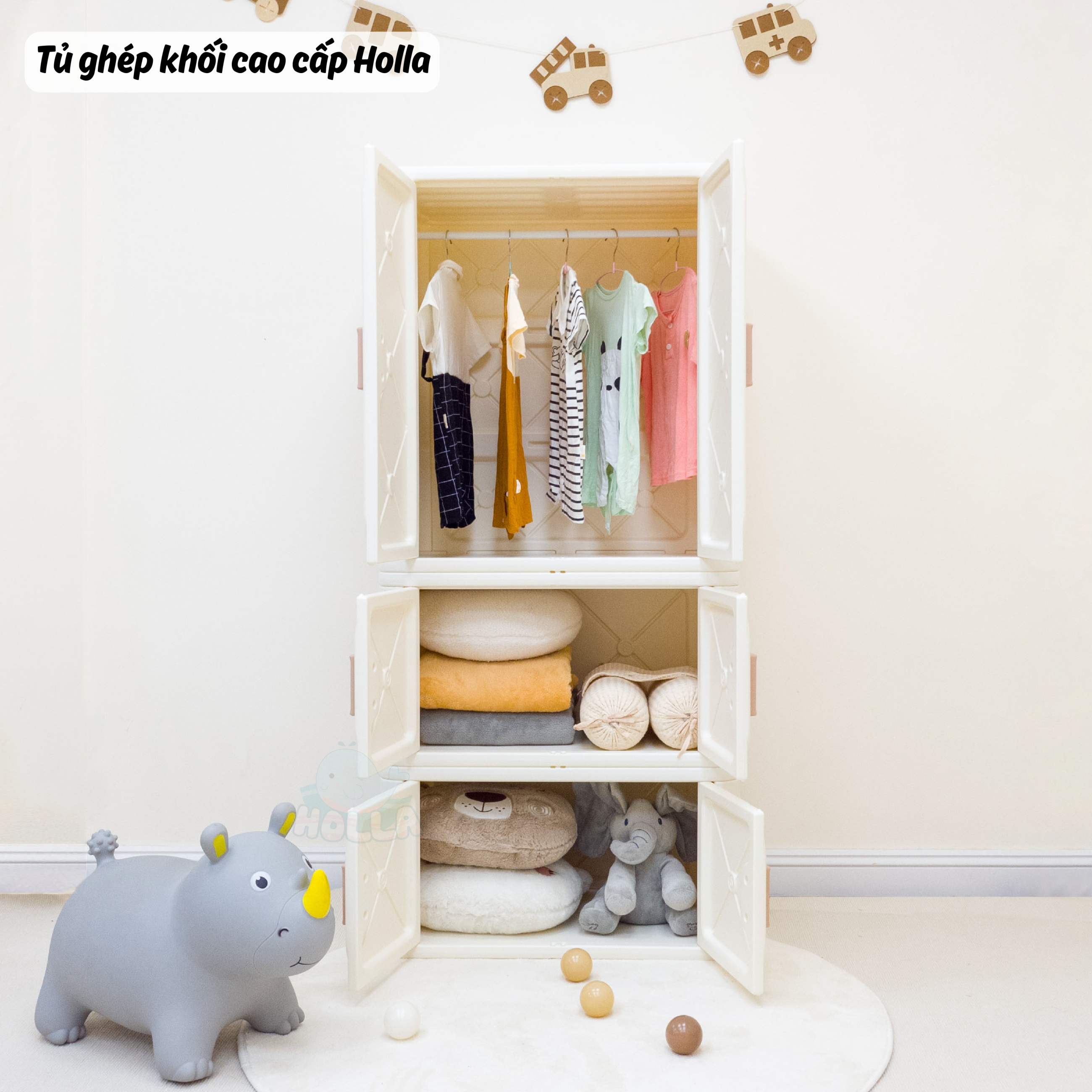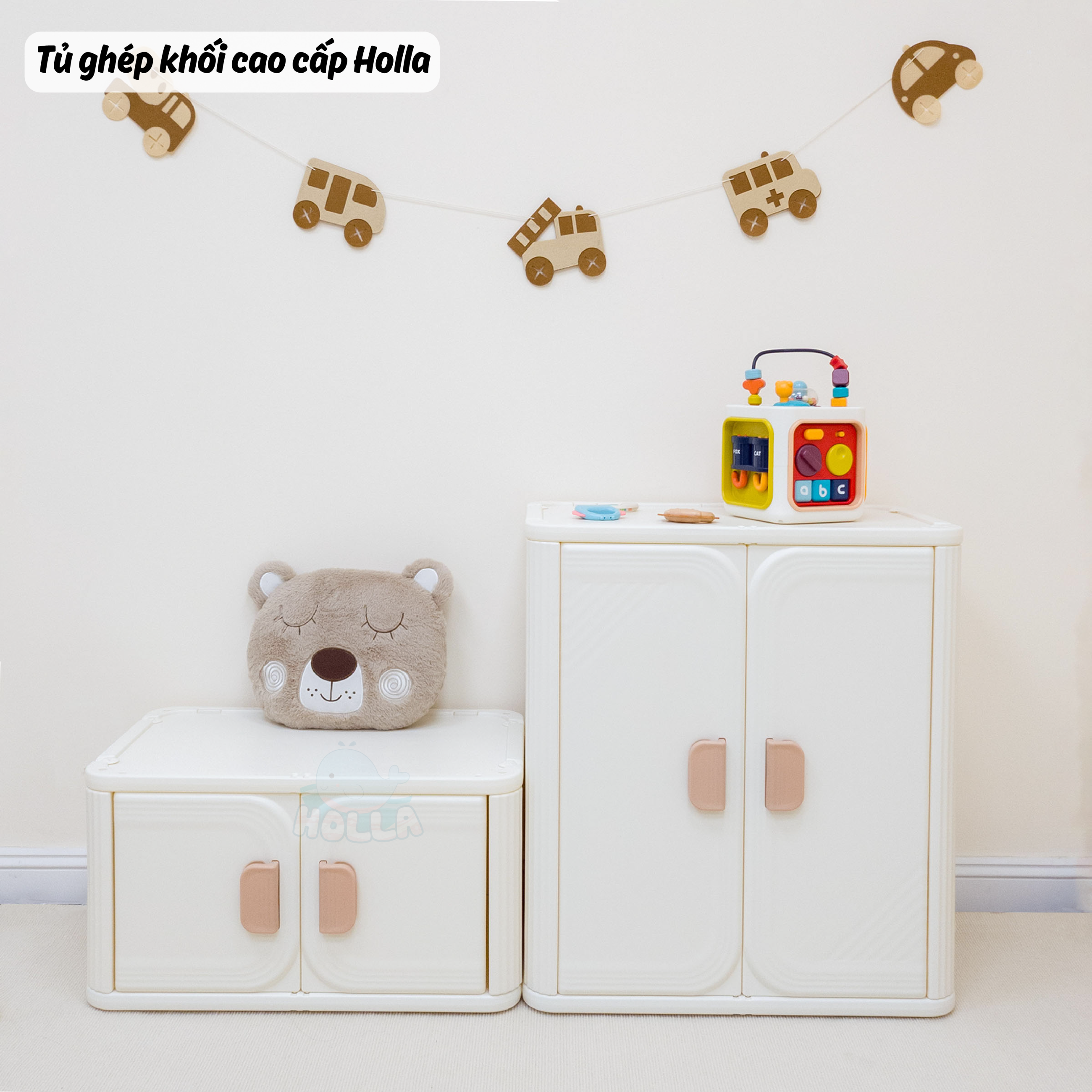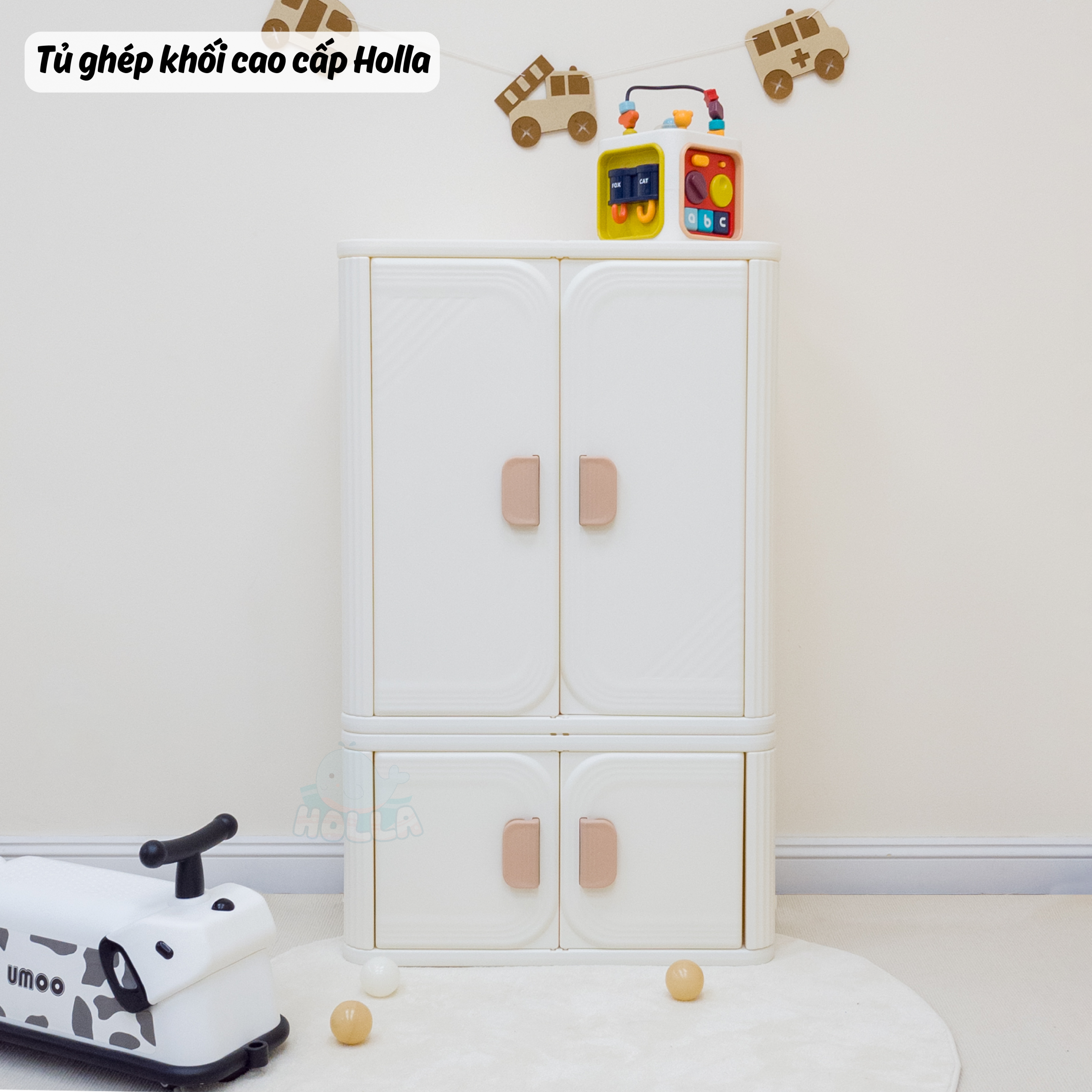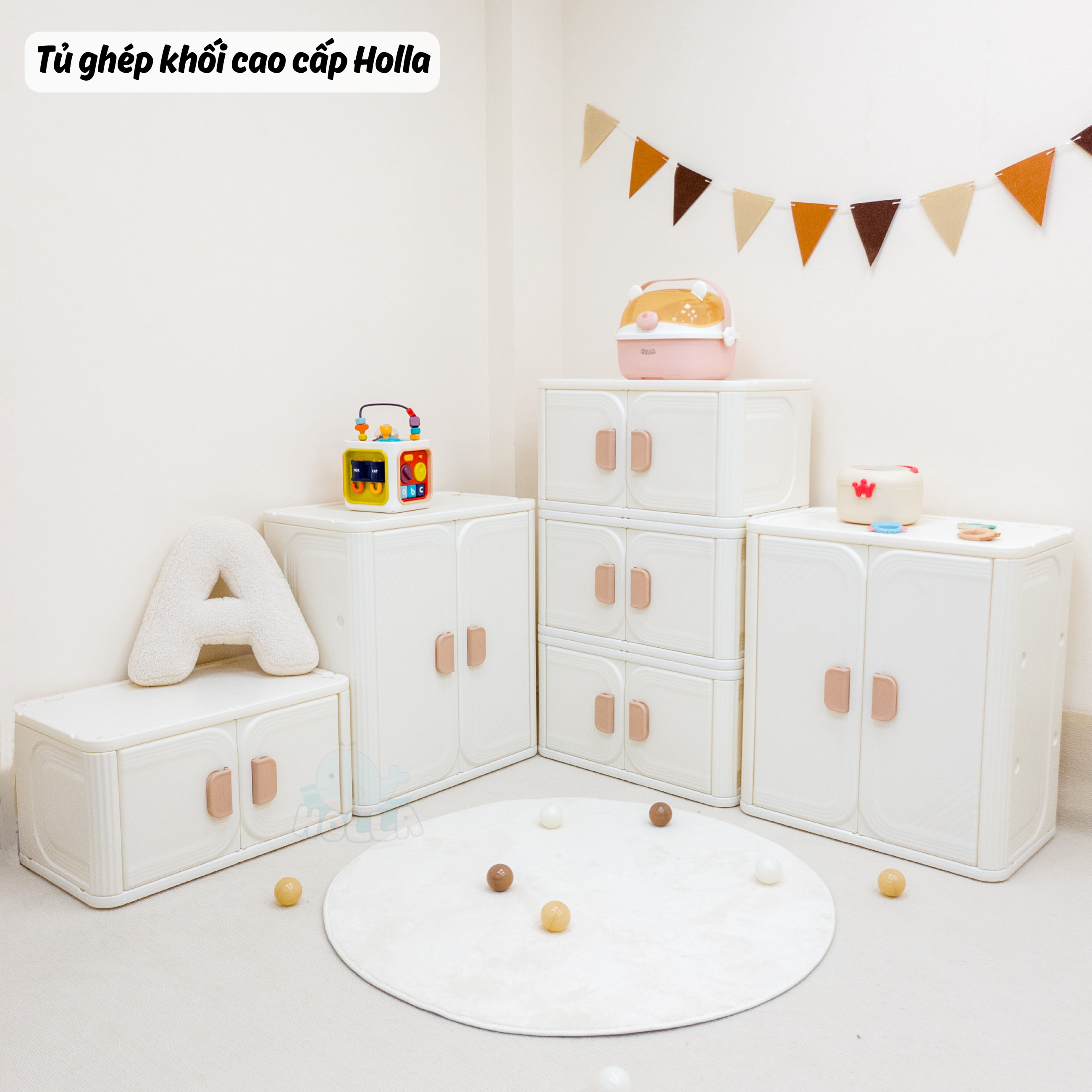 Chỉ 1 từ “siu phẩm” là không đủ để mô tả hết về độ đẹp của em ý. Cả góc nhà sáng bừng, gọn gàng, lung linh hẳn lên, tất cả là nhờ tủ ghép khối cao cấp Holla. Với 2 phiên bản tủ to và tủ nhỏ cho mẹ và bé thoải mái sắp xếp đồ đạc theo ý thích: